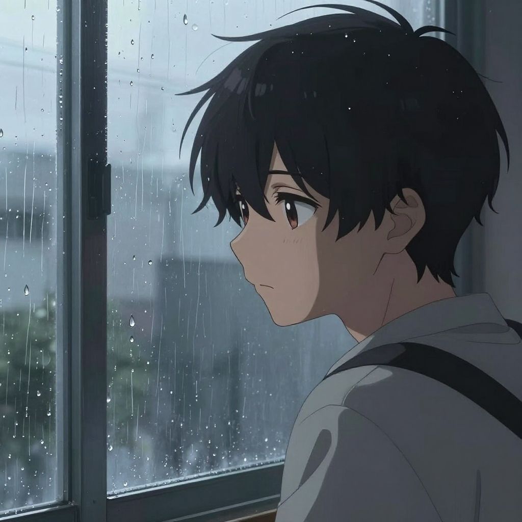 Anime boy depressed staring out a rainy window, raindrops tracing lines on glass, overcast sky, soft cool tones, introspective vibe, anime art style with high detail