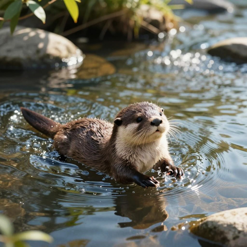 Highly detailed illustration of a playful baby otter swimming in gentle waves, in a calm riverbank shaded by leafy trees, with bright sunlight sparkling on rippling water, soft textures, serene mood, intricate fur patterns, HD quality, gentle shadows, creating an inviting atmosphere for relaxation