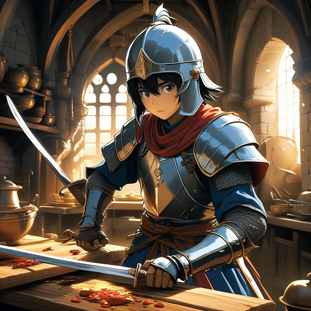 A young animated warrior dressed in blue and gold armor with a red belt stands confidently in a medieval-style kitchen, gripping a sword. The kitchen features tiled countertops and golden pots and pans neatly arranged around the room, with sunlight streaming through a large arched window.