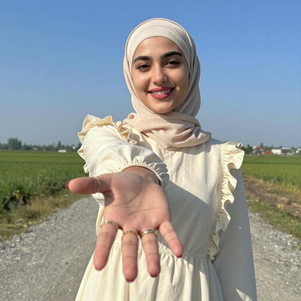 Photograph of a smiling young woman with light skin and pink lipstick, wearing a beige hijab and cream-colored dress with ruffled sleeves. She extends her right hand forward, adorned with gold rings and red nail polish. She stands on a gravel path with a bright blue sky and green field in the background.