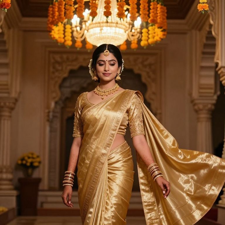 Photograph of a South Asian woman walking down a luxurious, ornately decorated hall. She is adorned in a gold silk saree with intricate embroidery and a long, draped pallu. Her jewelry includes a gold necklace, earrings, and multiple bangles. She has dark hair styled in a neat bun with a red bindi on her forehead. Her makeup is subtle yet elegant. The background features a large, glowing chandelier with orange flowers, and the walls are adorned with intricate carvings and archways. The lighting is warm, highlighting her golden attire and the rich textures of the setting.