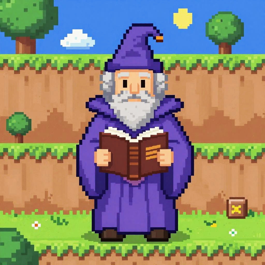 An extreme long shot showcasing a vibrant 8-bit landscape. The central figure is a old wizard with curly silver hair, embodying an arcane librarian. This pixelated masterpiece captures the essence of retro video games, influenced by the styles of Hayao Miyazaki and Sandra Dieckmann.