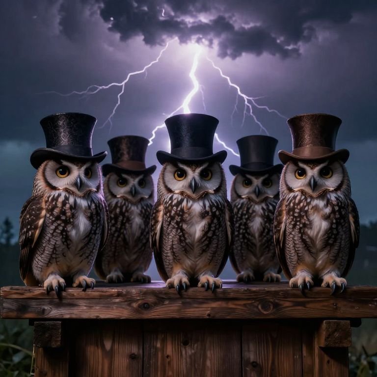 Five wise owls perched atop a wooden platform, each donning ornate top hats, gaze intently as lightning crackles above them in a dramatic thunderstorm, casting an eerie glow over their solemn assembly.