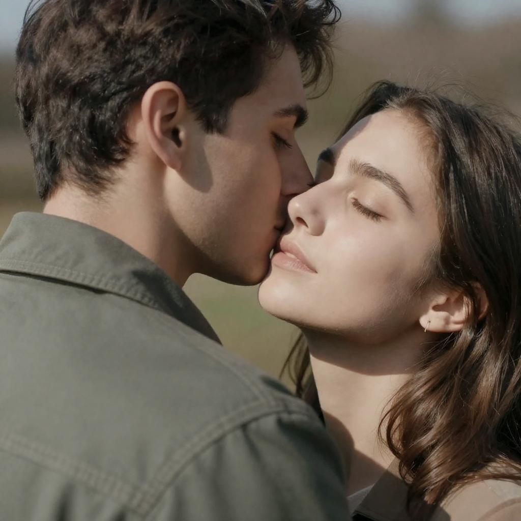 Photograph of two people in an intimate embrace. Female with long dark hair in black sleeveless top, male with short brown hair in white tank top. Dimly lit alleyway with brick walls, potted plant, and wooden bench. Eyes closed, facing each other, hands on each other's backs.