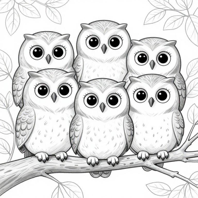 The image is a highly detailed, black-and-white illustration of a group of owl chicks perched on a tree branch. The owls are depicted with large, expressive eyes that gaze directly at the viewer, giving them a cute and endearing appearance. The thin, crisp lines used in the illustration create a sense of depth and realism, while the lack of color and shading allows for a clean, minimalist aesthetic. The owls are arranged in a somewhat haphazard manner, with some chicks overlapping and others facing different directions, creating a dynamic and lively scene. The tree branch they are perched on is adorned with delicate leaves, adding to the natural and serene atmosphere of the image. The overall composition is well-balanced, with the owls occupying the central focus, while the leaves and branches provide a natural frame. This illustration is reminiscent of advanced digital chibi art, inspired by Rajesh Soni, and is highly rated, making it a perfect choice for a nursery poster or streaming on Twitch.