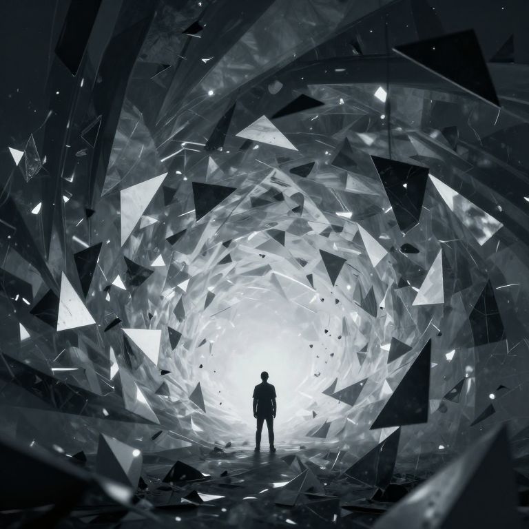 A solitary figure stands before a tempestuous vortex of fragmented triangles, each shard suspended defying gravity, as if caught in an eternal dance between chaos and order.
