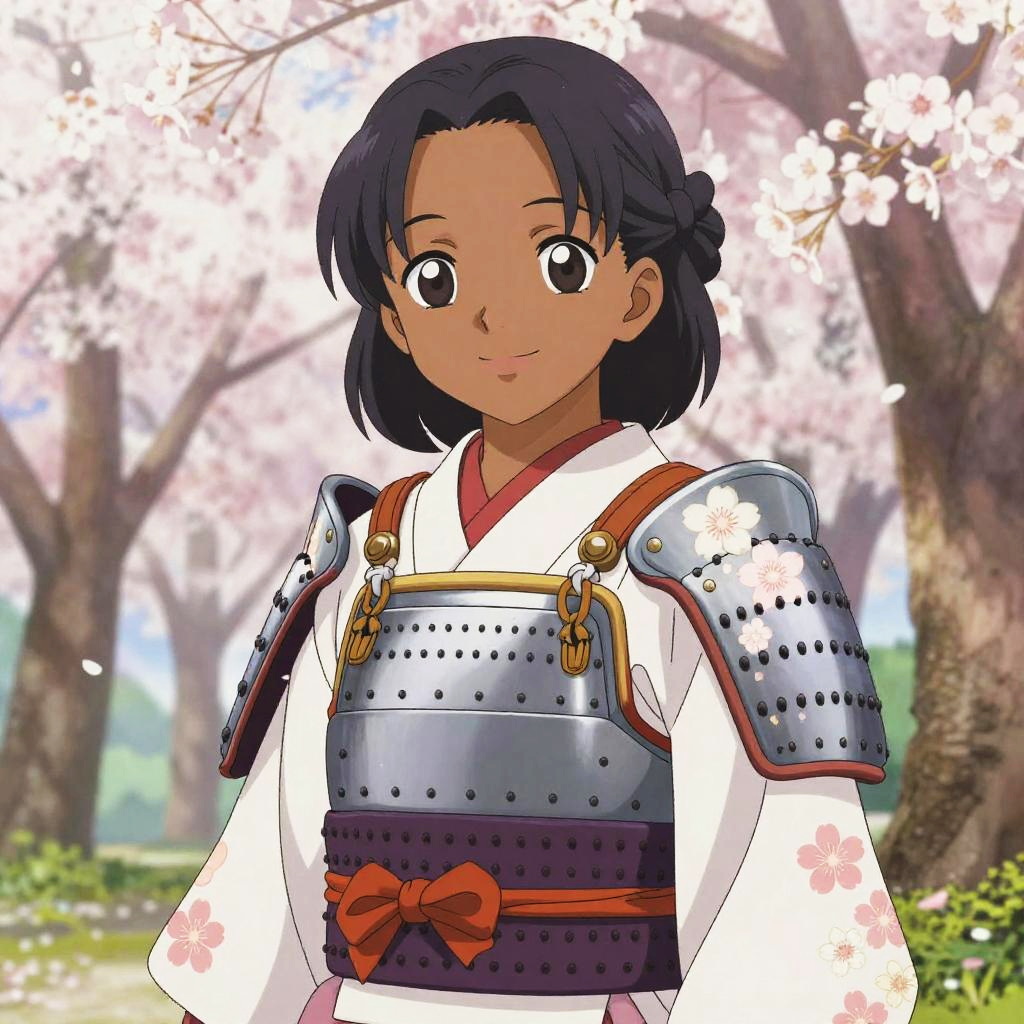 Pretty black girl anime protagonist in a serene cherry blossom garden, wearing traditional yet modernized samurai armor with delicate floral designs, gentle smile, expressive eyes full of kindness and strength, pastel colors and soft shading.