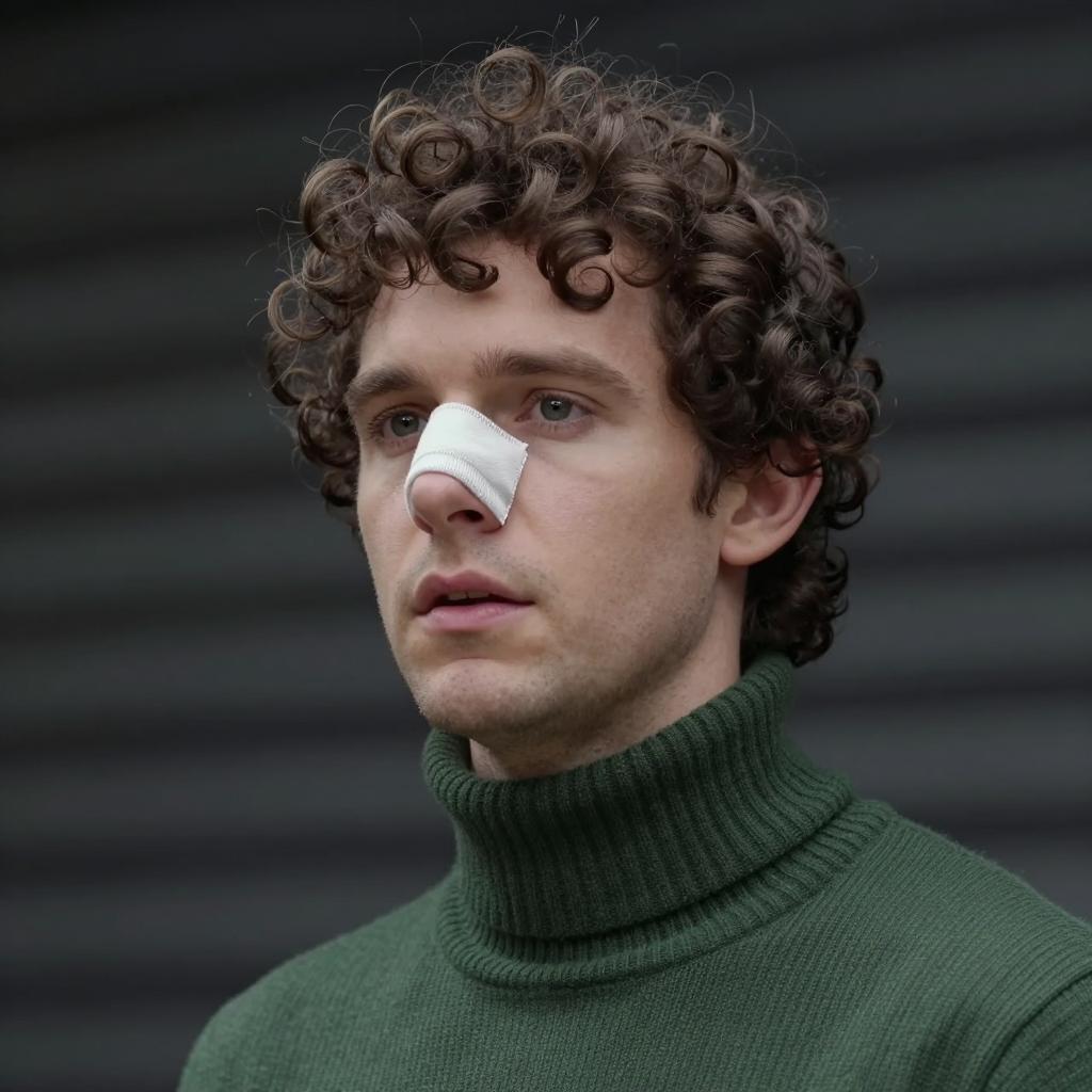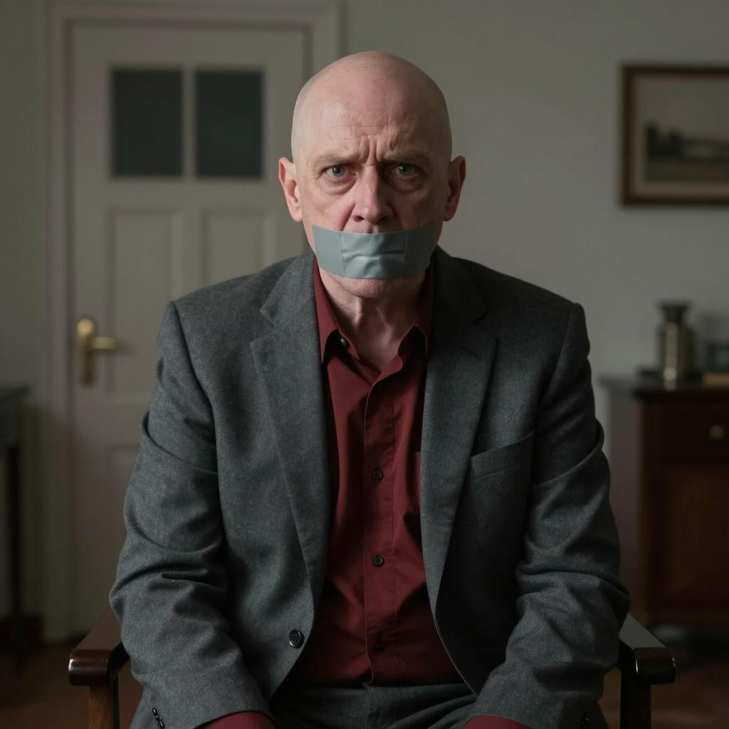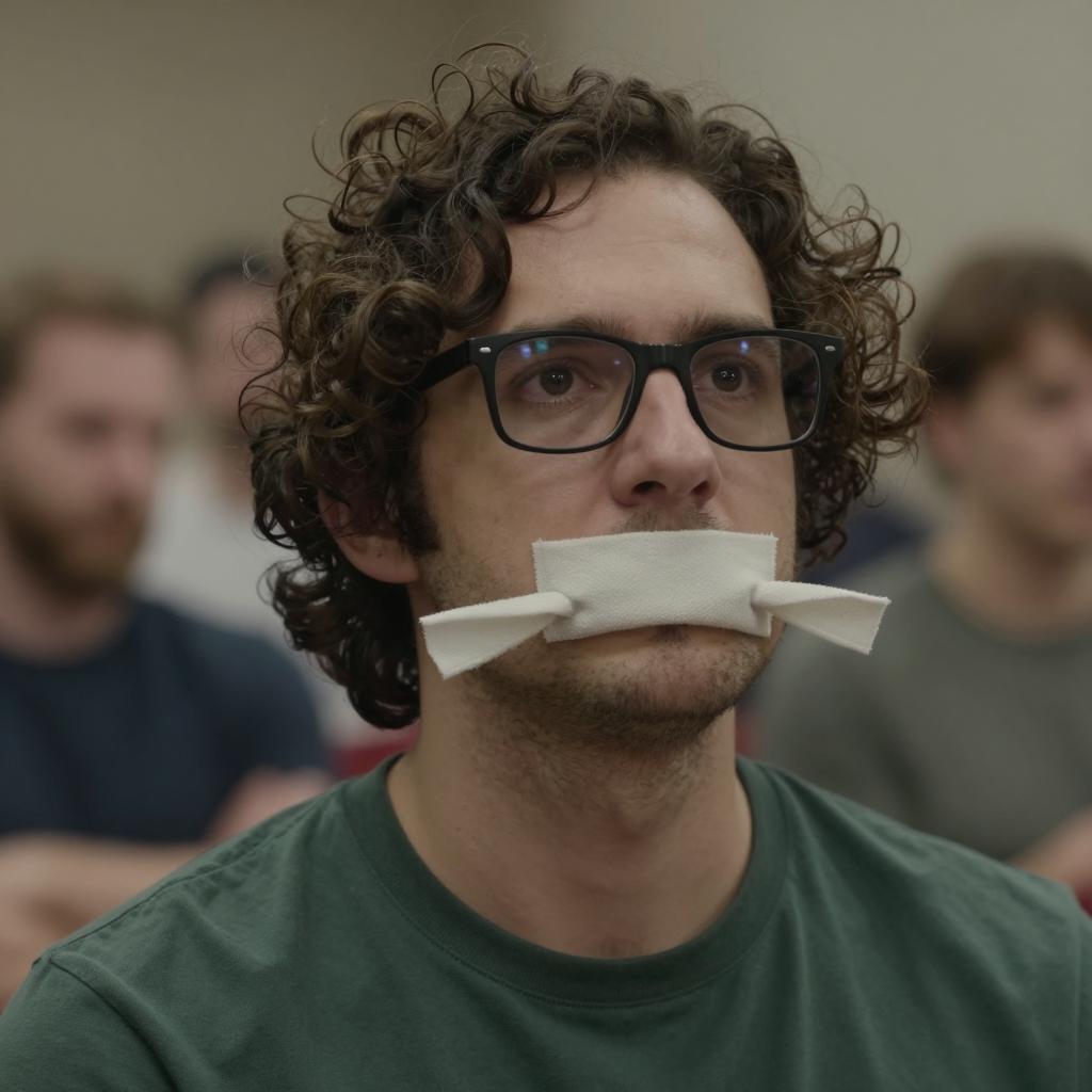 Man with curly brown hair, black rectangular glasses, green shirt, and white cloth gag over mouth, looking upward. Blurred background with indistinct people. Casual indoor setting, slightly dim lighting. Medium close-up.