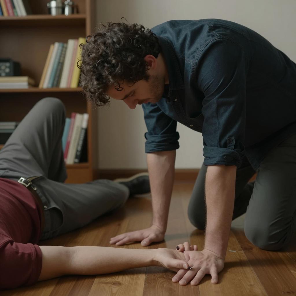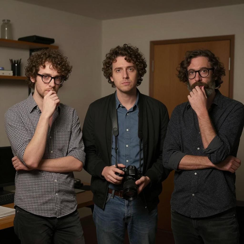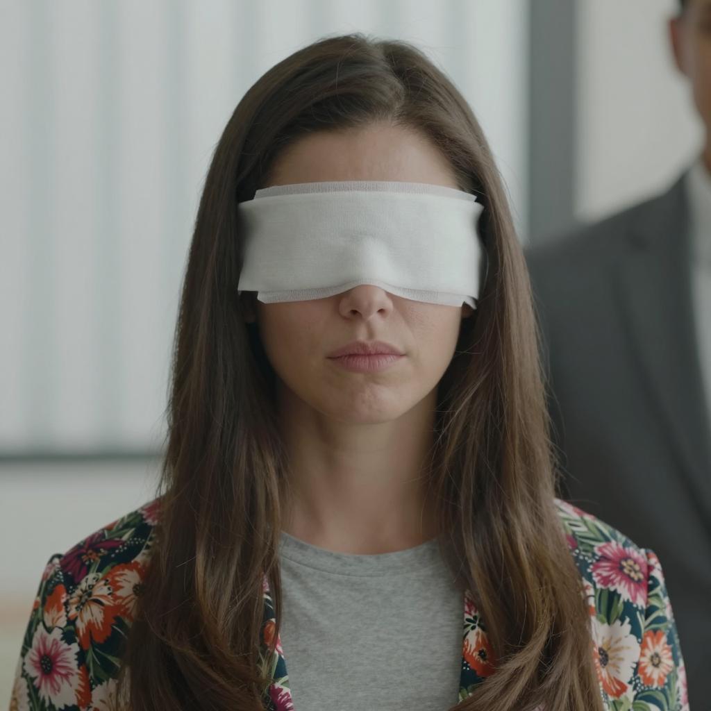 Man with curly brown hair, black rectangular glasses, green shirt, and white cloth gag over mouth, looking upward. Blurred background with indistinct people. Casual indoor setting, slightly dim lighting. Medium close-up.