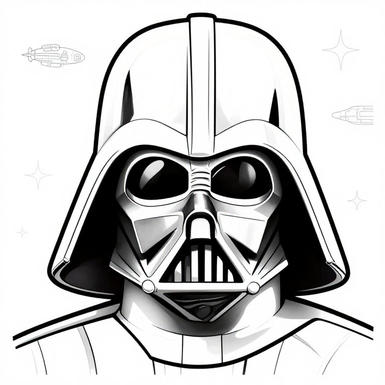 Mask Darth Vader coloring page showing the imposing mask with sharp geometric patterns and highlighted facial features, surrounded by subtle sci-fi elements like spaceship silhouettes and galactic stars, perfect for imaginative coloring.