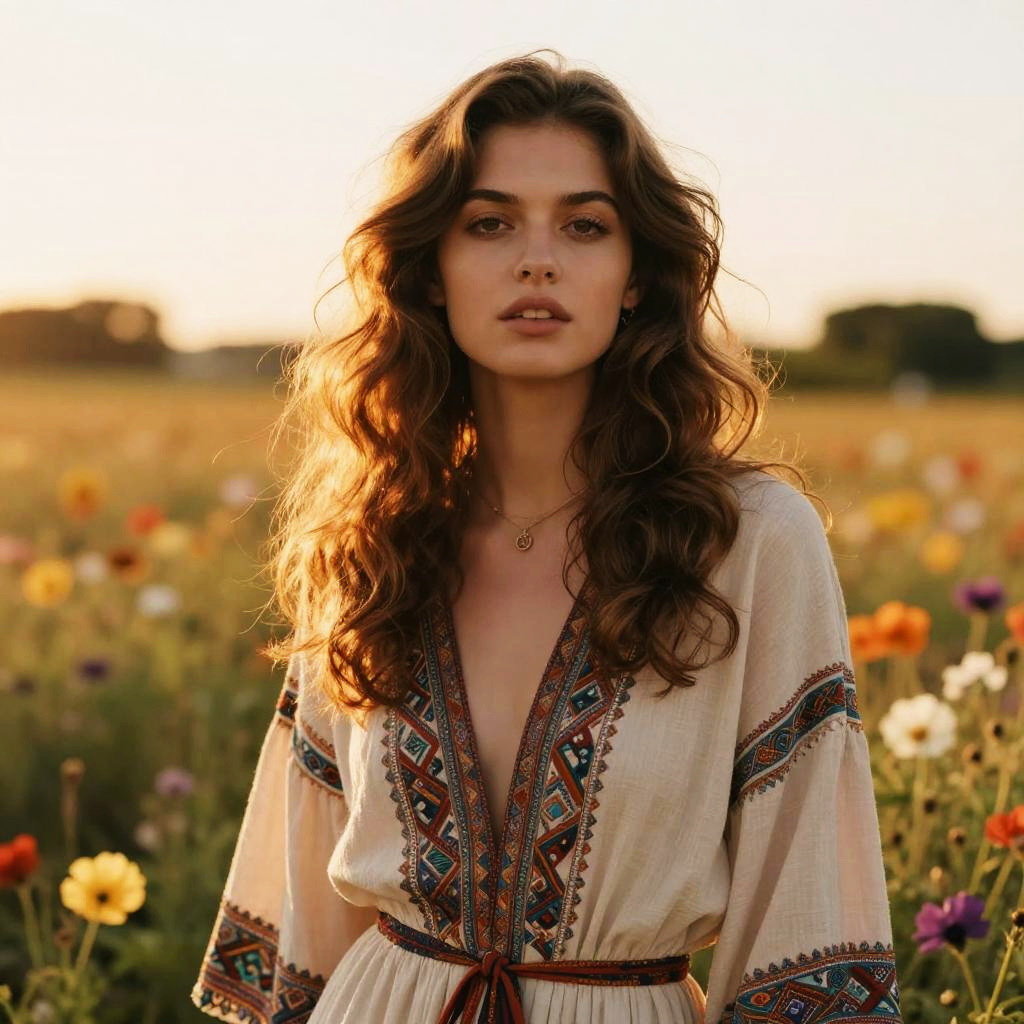 Wavy Blowout hairstyle on woman, wearing bohemian dress, in flower field, captured in fashion editorial style with diffused sunset glow.