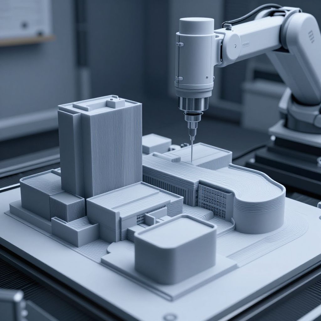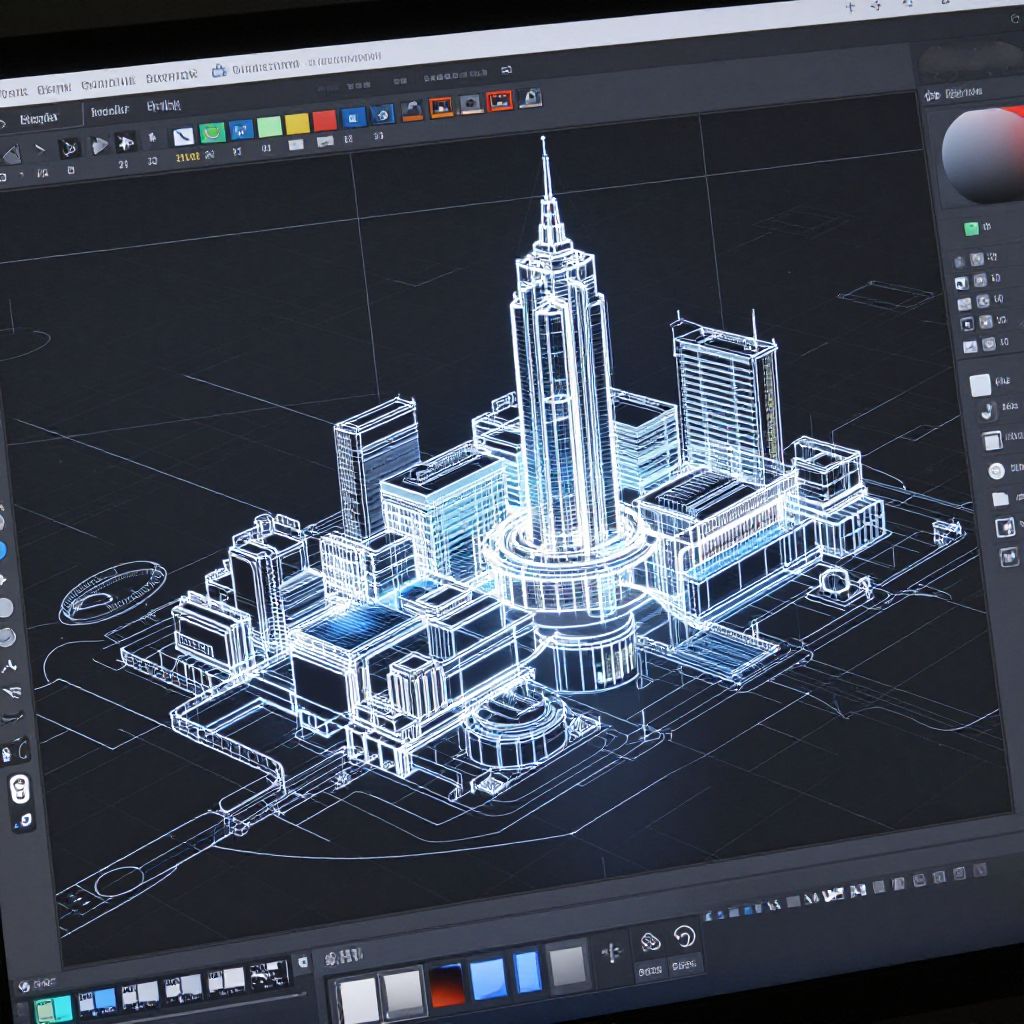 Digital sketch of a cityscape featuring a tall, illuminated skyscraper with surrounding buildings, displayed on a computer screen with a dark background and white lines.