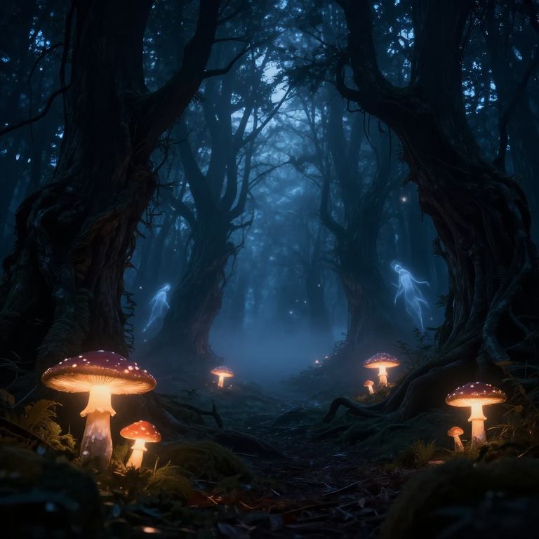 Digital artwork of a mystical forest with a large, twisted tree at center, glowing green fireflies illuminating its textured bark, surrounded by mist and towering