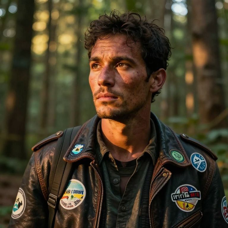 Capture a photorealistic portrait of a weary traveler with striking features, a sun-kissed complexion, and a rugged leather jacket adorned with travel stickers from far-flung places. Their gaze, unfocused, contemplates the distance as soft golden light filters through a dense forest canopy, casting a warm glow on their sturdy face and illuminating the passage of time etched in every line. This image blends the style of an environmental portrait with the emotional depth of fine art photography, drawing viewers into the traveler's introspective moment, enveloped in nature's tranquil embrace.