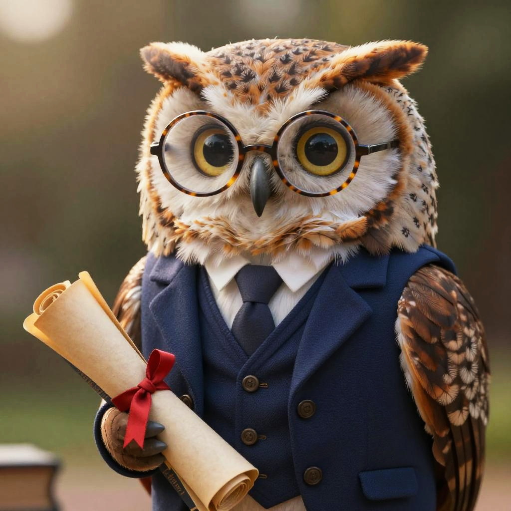 A 3D-rendered owl with creamy beige with speckled mahogany feathers, wearing classic tortoise shell round glasses and a rich navy blue blazer and vest, holding an ancient scroll tied with red ribbon. The owl has a curious, insightful expression, with finely detailed feathers and realistic texture on the suit. The scene is illuminated with diffused afternoon sunlight to enhance the character's depth, showcasing intricate detailing on the glasses and the book’s cover. The overall style combines a blend of realism and charm, perfect for a distinguished, scholarly vibe.