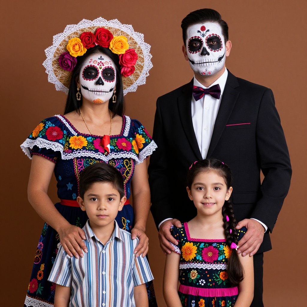 The image depicts a family dressed for the Mexican Day of the Dead, a traditional celebration honoring deceased loved ones. The family consists of four members: a woman, a man, a young boy, and a young girl. The woman, positioned to the left, wears a traditional Mexican dress adorned with vibrant floral patterns and a large, intricate hat decorated with lace and flowers. Her face is painted with a detailed sugar skull design, a common symbol of the Day of the Dead. The man, standing to the right, is dressed in a formal suit with a bow tie, his face similarly painted with a sugar skull design. The young boy, standing in front of the woman, is dressed in a striped shirt, while the young girl, standing in front of the man, wears a dress with floral patterns and her hair styled in braids. The overall composition is balanced, with the family members arranged in a line, creating a sense of unity and tradition. The background is a warm, earthy tone, which contrasts with the detailed and colorful sugar skull designs on the family's faces, emphasizing the cultural significance of the celebration.