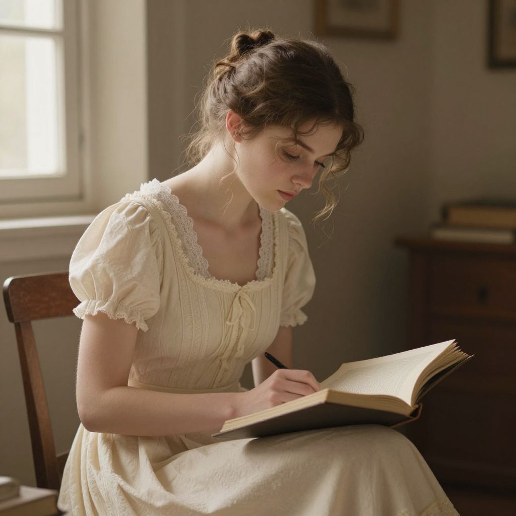A finely detailed digital illustration inspired by Harrison Fisher's style, depicting a young woman in a vintage cream dress engrossed in her studies, with soft natural lighting enhancing the serene and contemplative atmosphere of the scene.