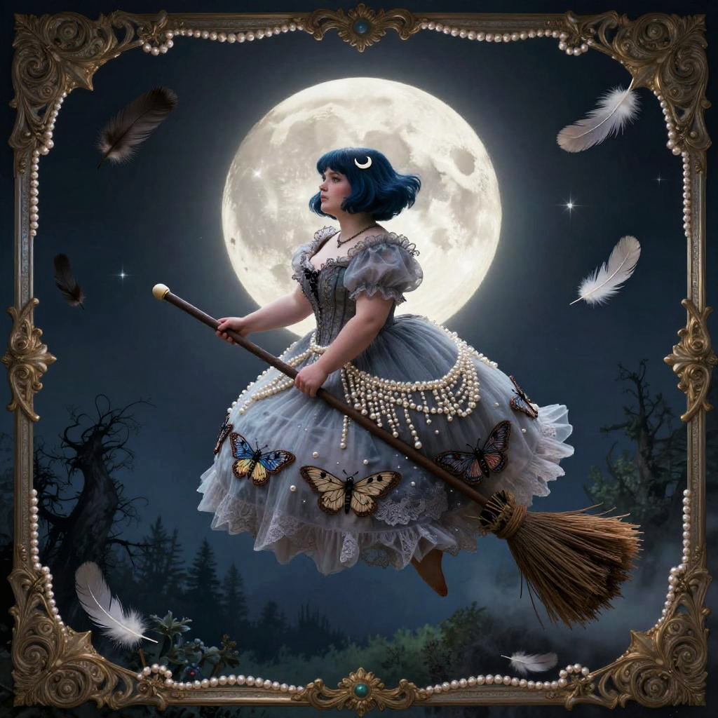 A whimsical, gothic fairytale illustration of a plump and magical woman with short choppy midnight-blue bob with crescent moon clips, flying through a surreal night sky on a broom, surrounded by feathers and pearls, in front of a glowing full moon. She wears a voluminous hand-painted mourning frock with layered tulle, pearl fringe, and embroidered moth motifs with delicate lace and ornate details, framed by an elaborate vintage border. The scene is rendered in a highly decorative style with muted jewel tones and a mystical forest below.