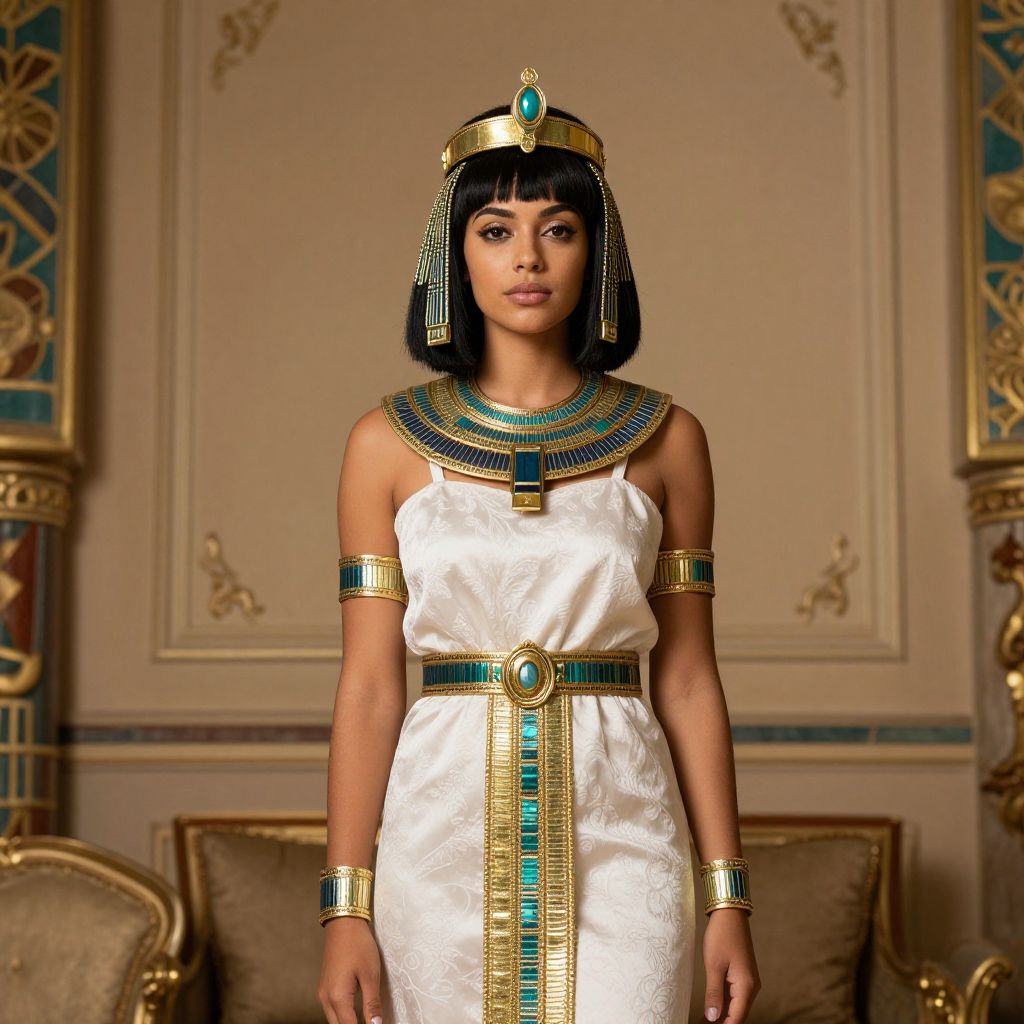 Photograph of a young woman with medium brown skin and straight black bob haircut, wearing an ancient Egyptian-inspired outfit. She has a white, sleeveless, knee-length dress adorned with gold and turquoise accents, including a broad collar, arm bands, and a belt with a turquoise gem. Her head is crowned with a golden headdress featuring turquoise and white beads. The background is an opulent room with beige walls, ornate gold and blue patterns, and plush, gold-accented furniture. The lighting is soft, highlighting her serene expression and the intricate details of her attire.