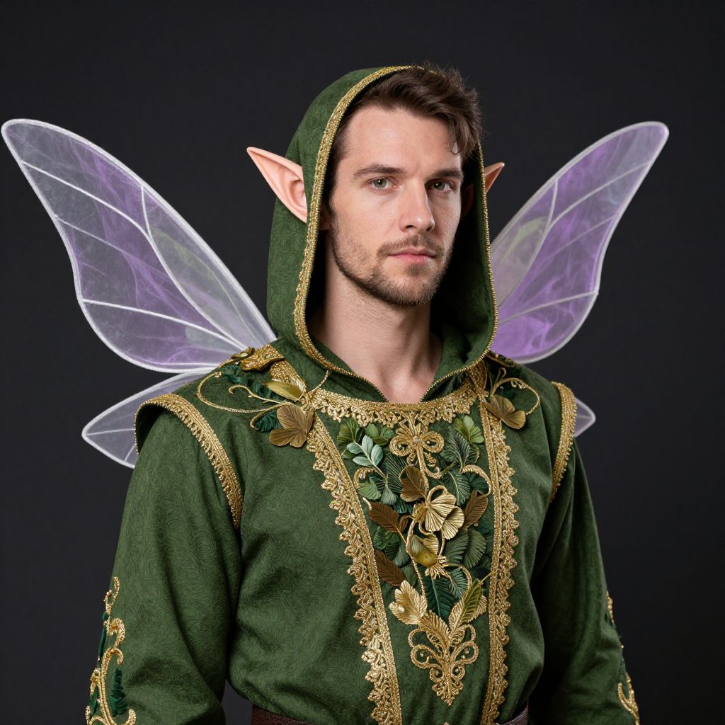 The man is dressed in a detailed, photorealistic fairy costume featuring a green hooded tunic adorned with golden embroidery and natural elements. He wears pointed elf-like ears and delicate translucent purple wings, all captured in a studio portrait style against a dark background.