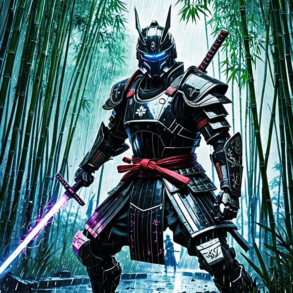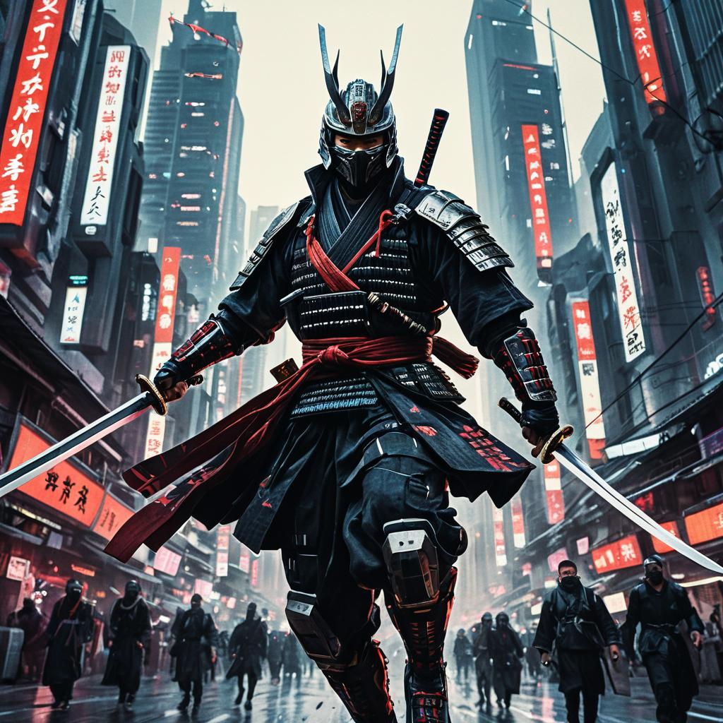 Cyborg Samurai on Neon-Lit Tokyo Street