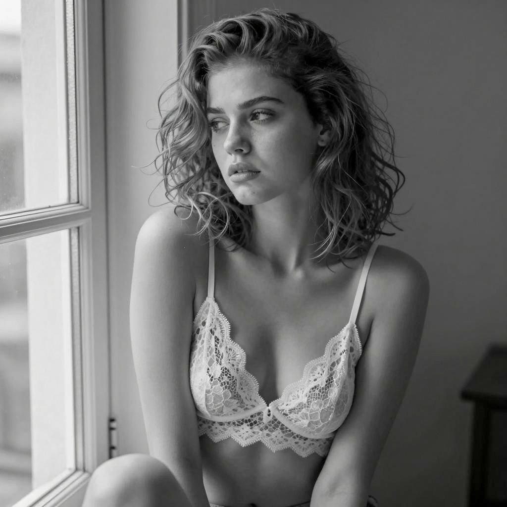 Black and white photograph of a young Caucasian woman with wavy, disheveled hair sitting near a window. She is wearing a white lace lingerie top with spaghetti straps. Soft natural light from the window highlights her intense, slightly pouty expression and slender figure. The window has a worn wooden frame, adding a classic aesthetic to the indoor setting.