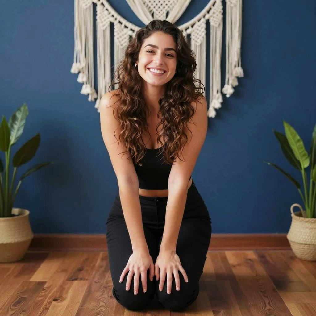 Photograph of a smiling woman with wavy brown hair, wearing a black sleeveless top and black pants, kneeling on a wooden floor. She has light skin and is looking directly at the camera. Behind her is a dark blue wall with a white macrame wall hanging and two potted plants on either side. The lighting is bright and even.