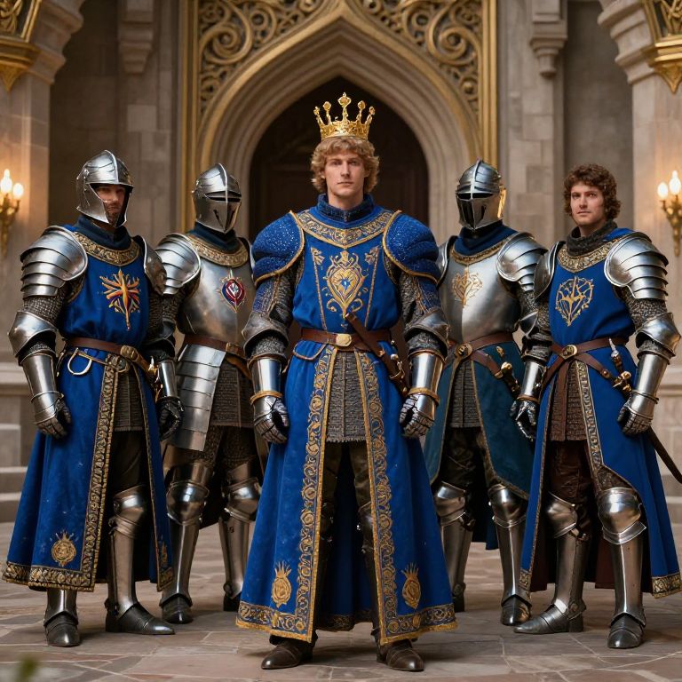 Create uniform visuals for a fantasy realm’s royal guard, merging medieval armor motifs with magical accents, vibrant colors like royal blue and gold, detailed embroidery, and symbolic insignia, positioned in an ornate castle courtyard under dramatic lighting.