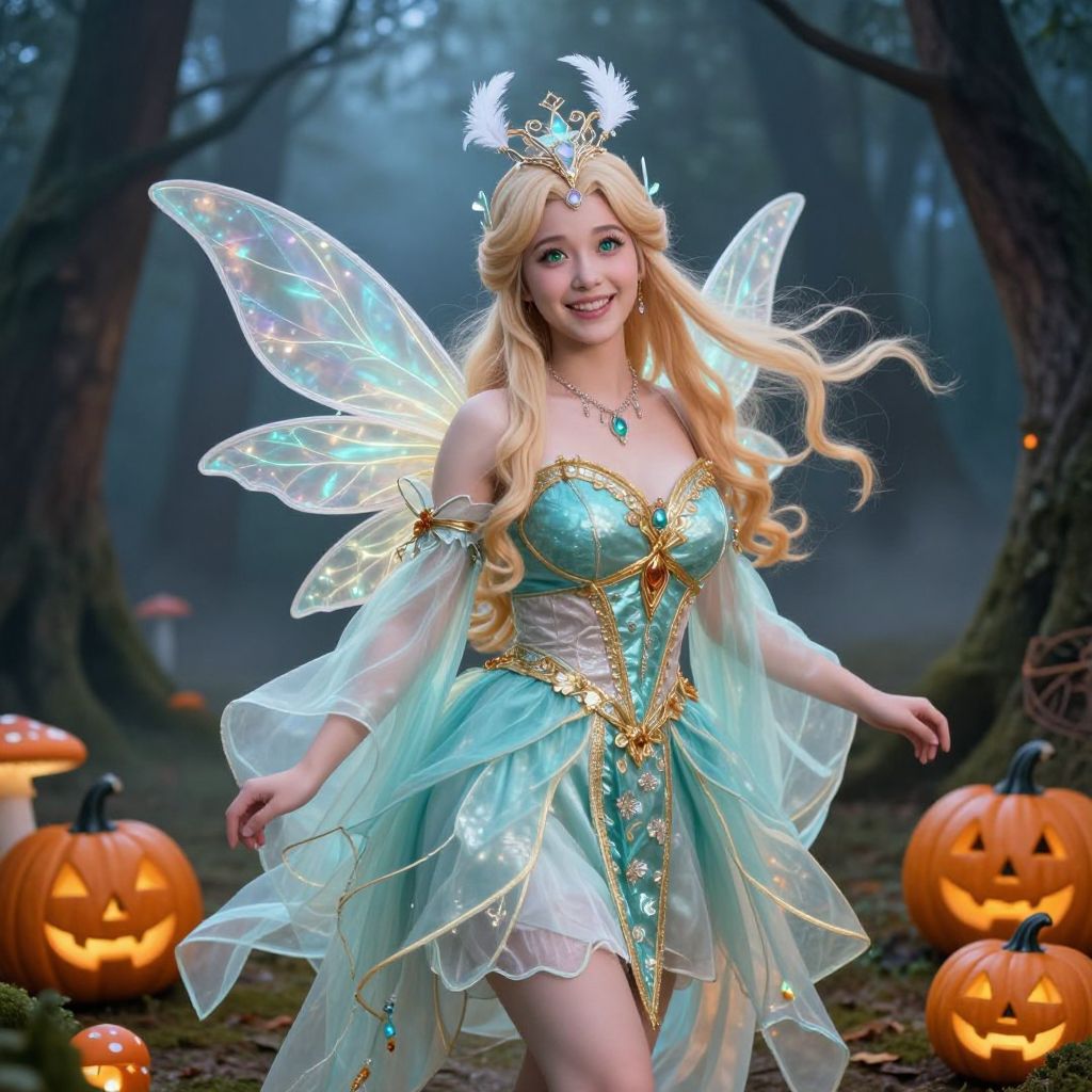 A joyful young woman in a regal fantasy Halloween costume — a fairy queen outfit with flowing turquoise and gold embroidered dress, feathered headdress, and glowing magical wings made of translucent fabric, standing in a misty forest at twilight, surrounded by pumpkins and glowing mushrooms, her face has soft peach skin, bright green eyes, and long, loose blonde hair that gently flows behind her as wind blows through the trees.. The woman has big tits and cute face
