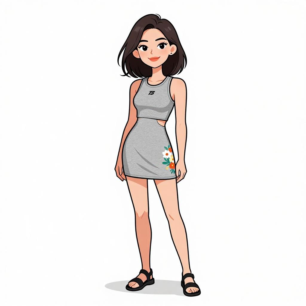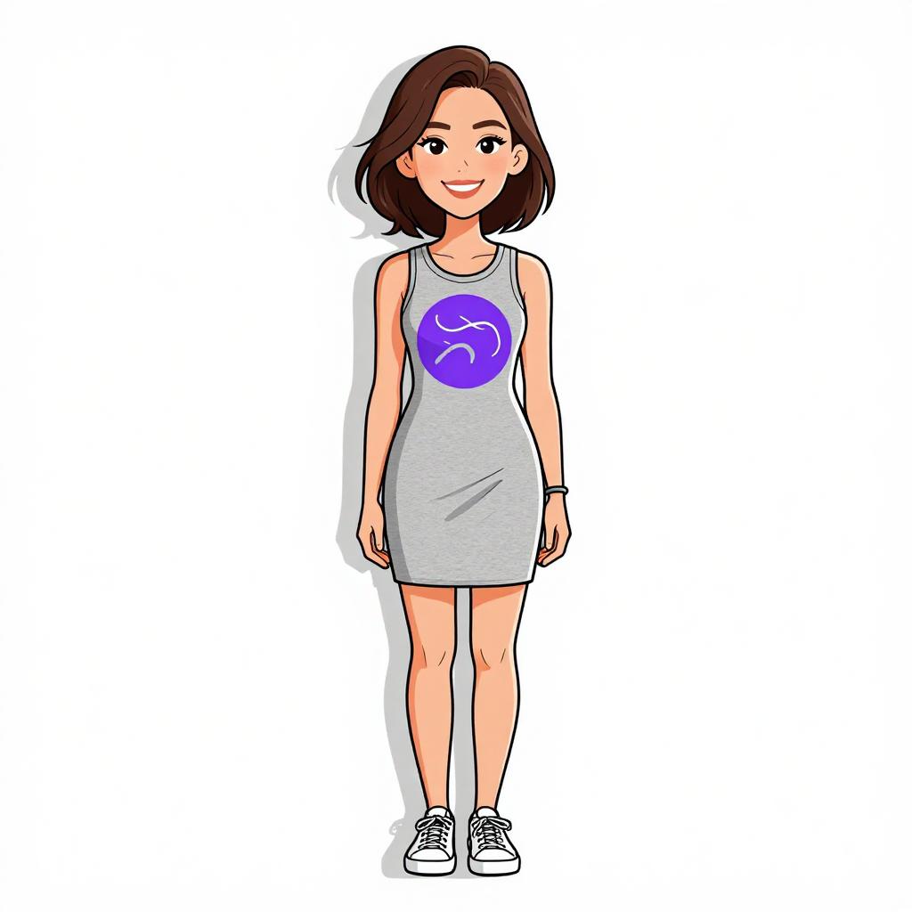 This digital illustration depicts a young woman with light skin and short brown hair, standing against a plain white background. She wears a sleeveless, gray dress with a purple spiral design on the chest, and white sneakers with white socks. Her arms rest naturally by her sides, and she has a slight, friendly smile. Her eyes are large and expressive, adding a playful vibe to her appearance. The artwork uses bold, clean lines and vibrant colors typical of modern digital cartoon styles, with a focus on simplicity and clarity.