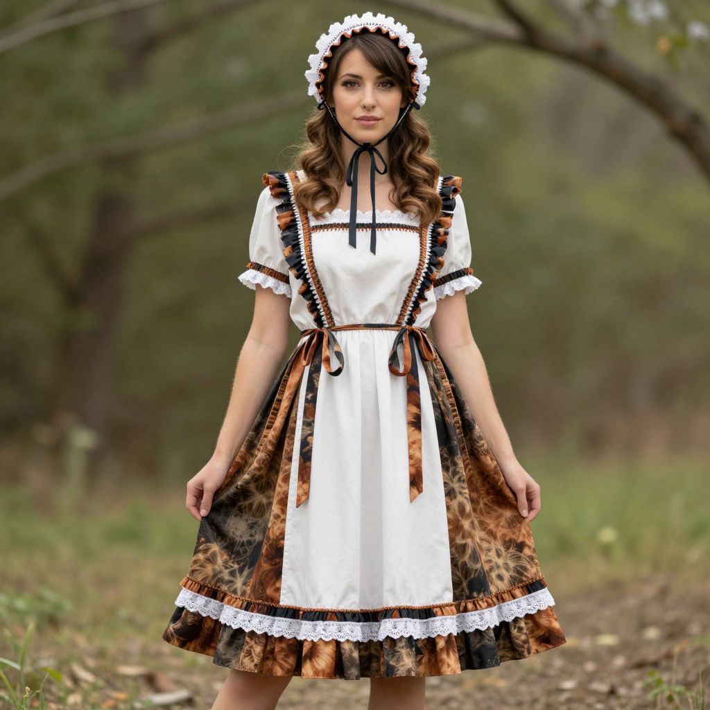Photograph of a young woman with wavy brown hair, wearing a white maids' dress with leopard print accents, black lace trim, and a