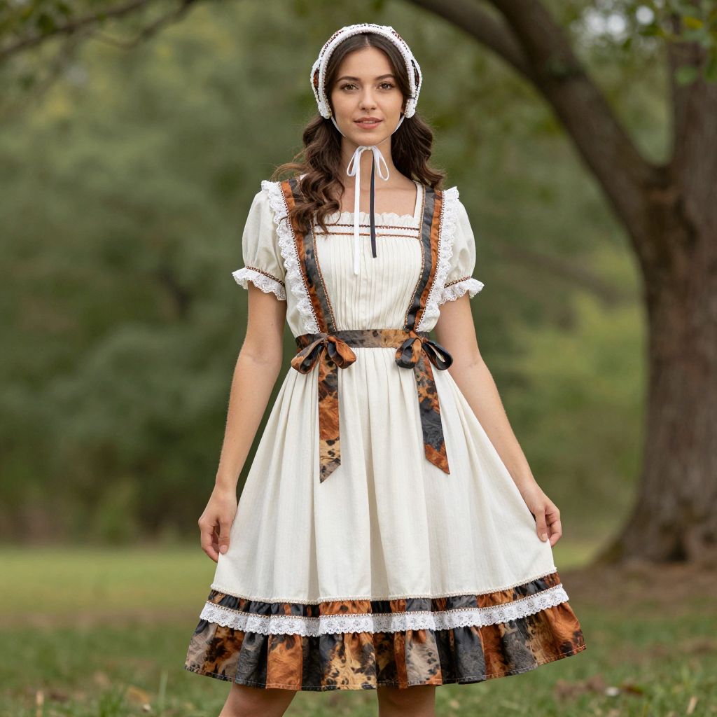 Photograph of a young woman with fair skin and wavy brown hair, wearing a white maid dress with brown, leopard-printed fabric accents, black lace trim, and a white lace headband. The dress has a black ribbon tie at the neckline and a brown ribbon waist sash. She stands in a blurred, green forest background with trees and grass. Her expression is neutral, and she stands with her arms slightly apart, hands resting on the sides of her dress. The sunlight filters through the trees, casting soft shadows. The overall style is vintage-inspired with a touch of whimsy.