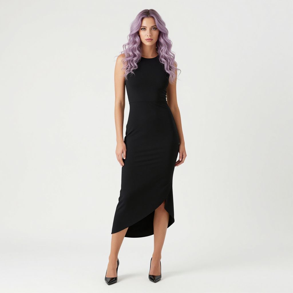 A stylish woman with long, curly lavender hair stands confidently against a plain white background. She wears a fitted black dress with a high-low hem and black heels, exuding elegance and modern fashion sense in a minimalistic setting.
