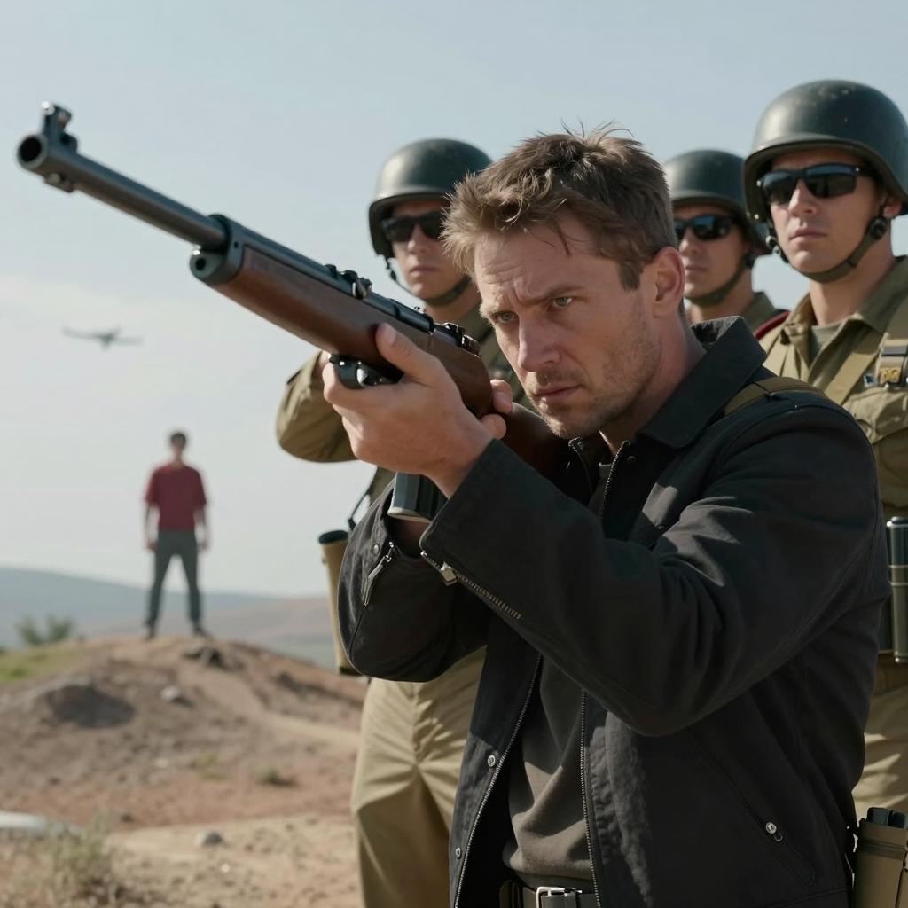 A man with disheveled brown hair runs across a dusty, barren landscape. He wears a dark jacket and light pants, with his right arm extended forward and his left arm holding a black circular object. His right leg is kicked back. The background is a flat, empty horizon. Dust swirls around him.