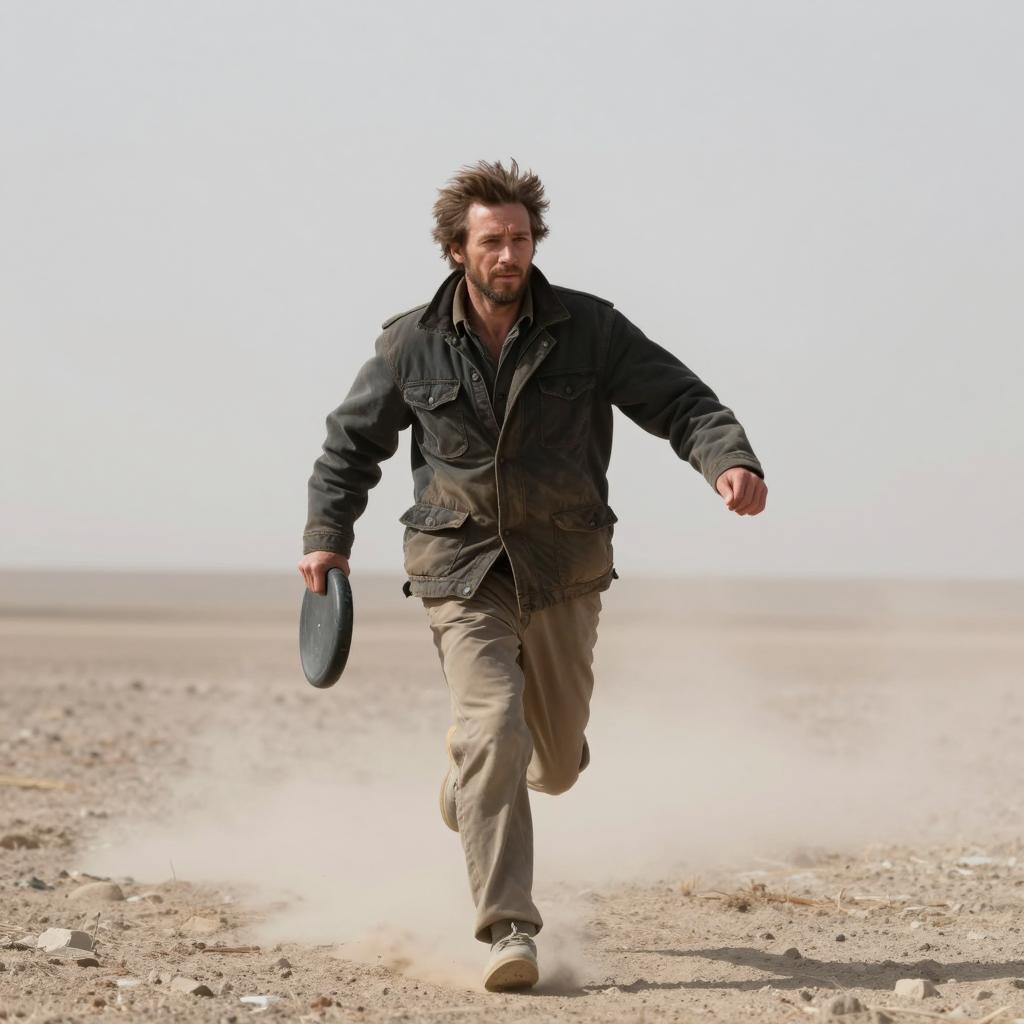A man with disheveled brown hair runs across a dusty, barren landscape. He is wearing a dark jacket with multiple pockets and light-colored pants. The man holds a black circular object in his left hand while his right arm is extended forward. The background reveals a flat and empty horizon with dust swirling around his feet.