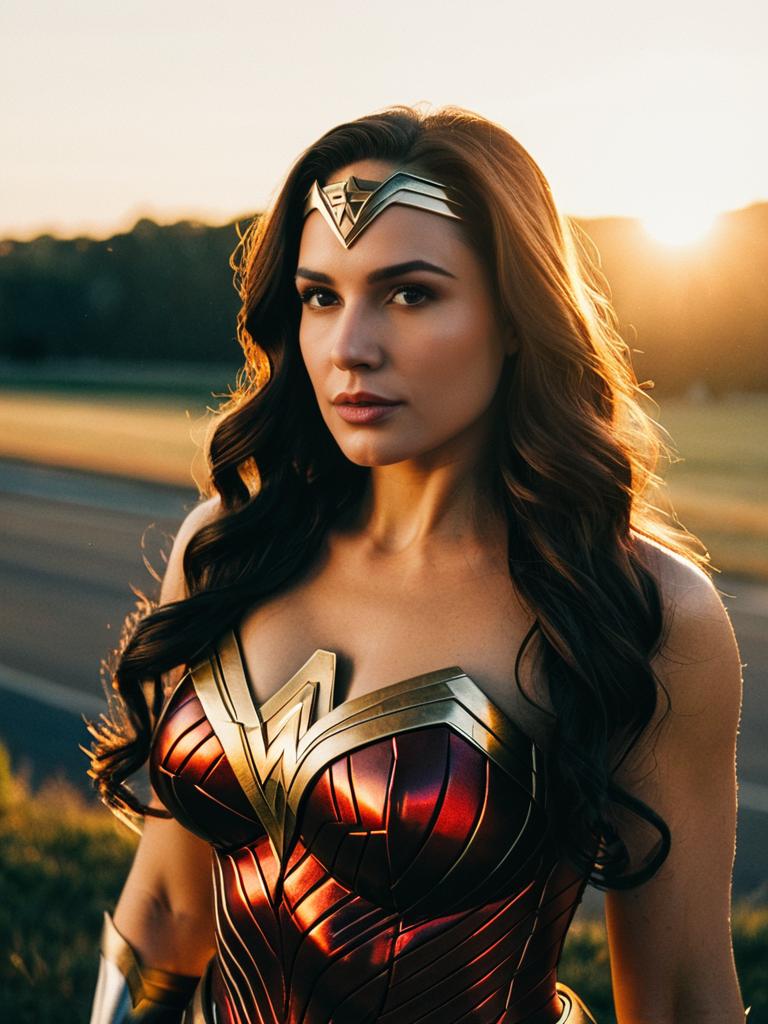 Woman in Wonder Woman costume, photorealistic outdoor golden hour portrait