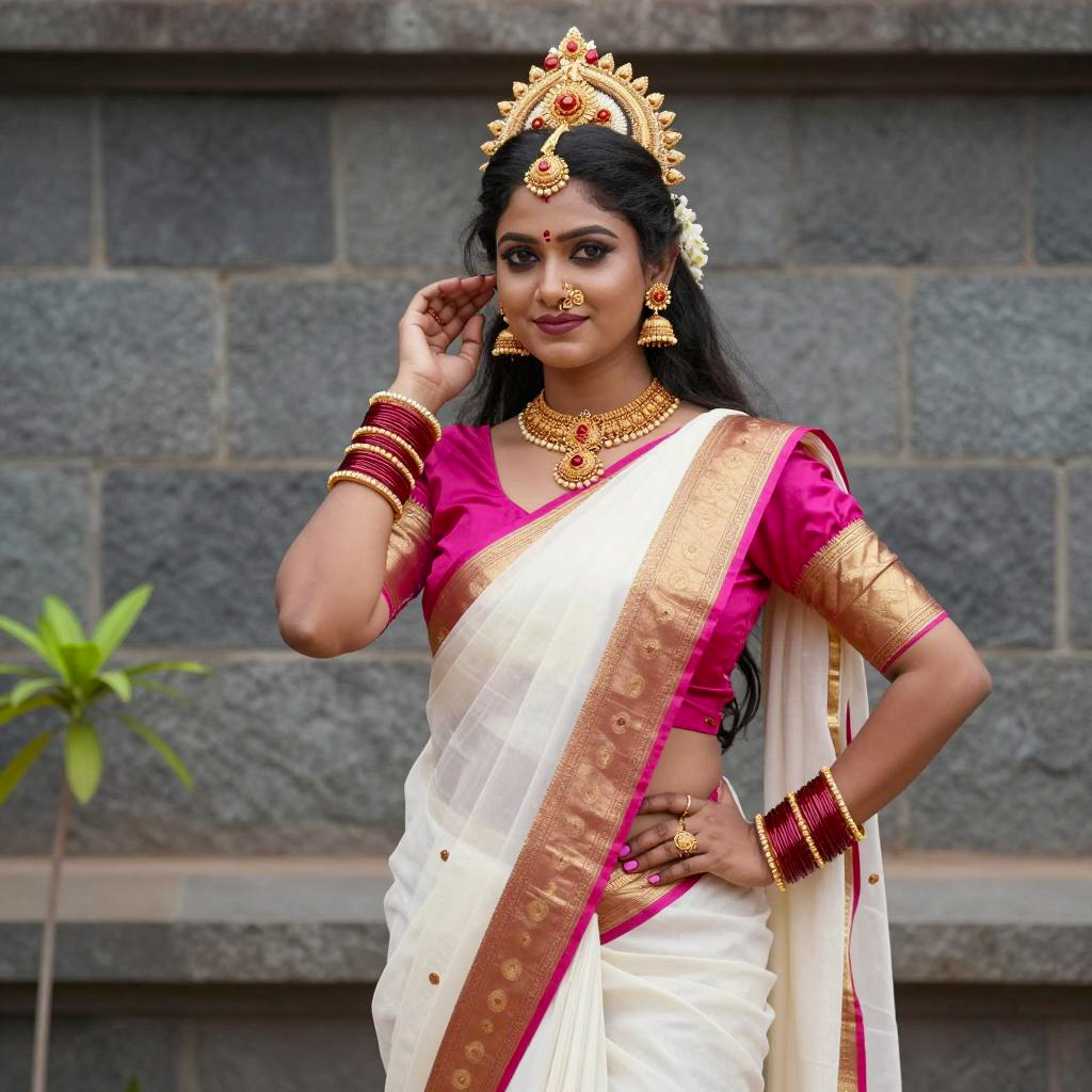 Navratri special costume, photograph of Indian woman wearing traditional white sari with pink and gold borders, ornate gold and red headdress with circular pattern, multiple gold and red bangles on both wrists, matching gold necklace and earrings, standing in front of stone wall, long black hair, subtle makeup, outdoor setting, small green plant on left, daytime, natural light, cultural attire, traditional jewelry, stone ure in background, poised stance, confident expression