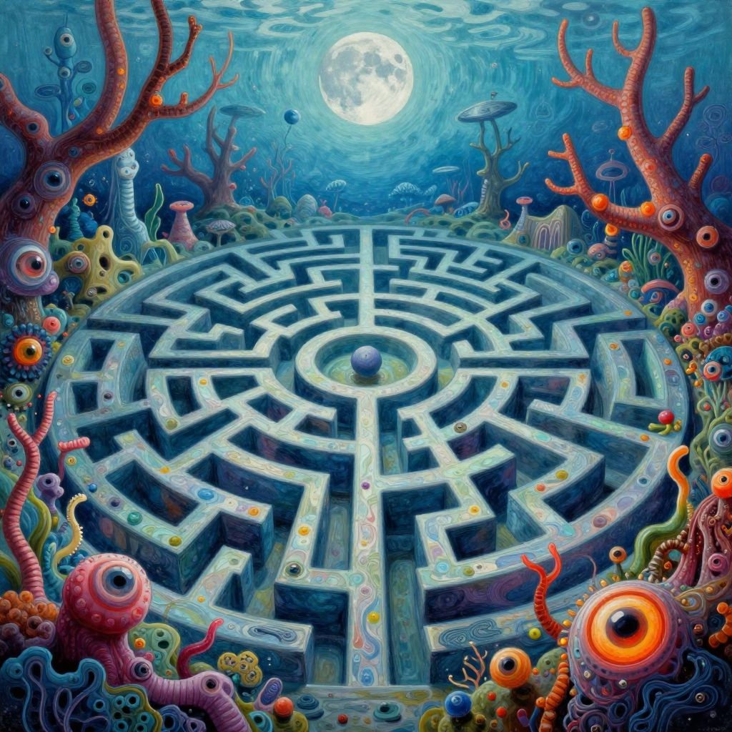 This vibrant, digital illustration depicts a surreal underwater maze, illuminated by a glowing full moon above. The maze, made of dark stone, features intricate pathways leading to a central blue sphere. Surrounding the maze are colorful, alien-like coral formations, including red, pink, and purple branches with eye-like structures. Multicolored fish and jellyfish swim in the blue, swirling water. The background includes underwater plants and bubbles, enhancing the fantastical, otherworldly atmosphere. The image's rich colors and detailed textures create a whimsical, dream-like scene.