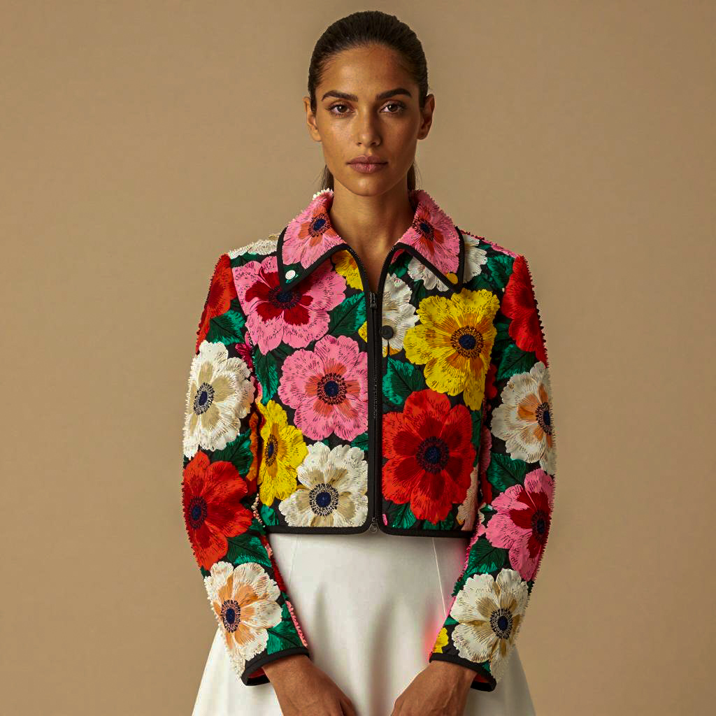 Photograph of a young woman with long, wavy black hair, standing in a wooden warehouse. She wears a colorful, crocheted jacket with large, multicolored flower patterns and a high collar. Her hands are in the jacket's pockets. She has a neutral expression. The background shows wooden beams and a corrugated metal wall.