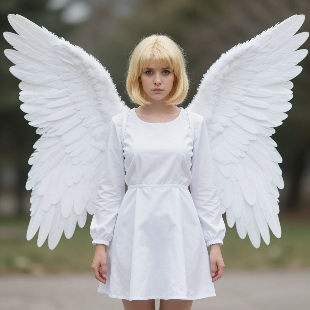 Photograph of a young blonde woman with a bob haircut, wearing a white long-sleeve dress and large, detailed white angel wings. She stands in an outdoor setting with a blurred background of greenery and trees. Her expression is neutral, and the image is brightly lit, highlighting the stark contrast between her white attire and the surrounding nature. The wings are prominently displayed, with individual feathers visible, adding a sense of ethereal beauty to the scene.