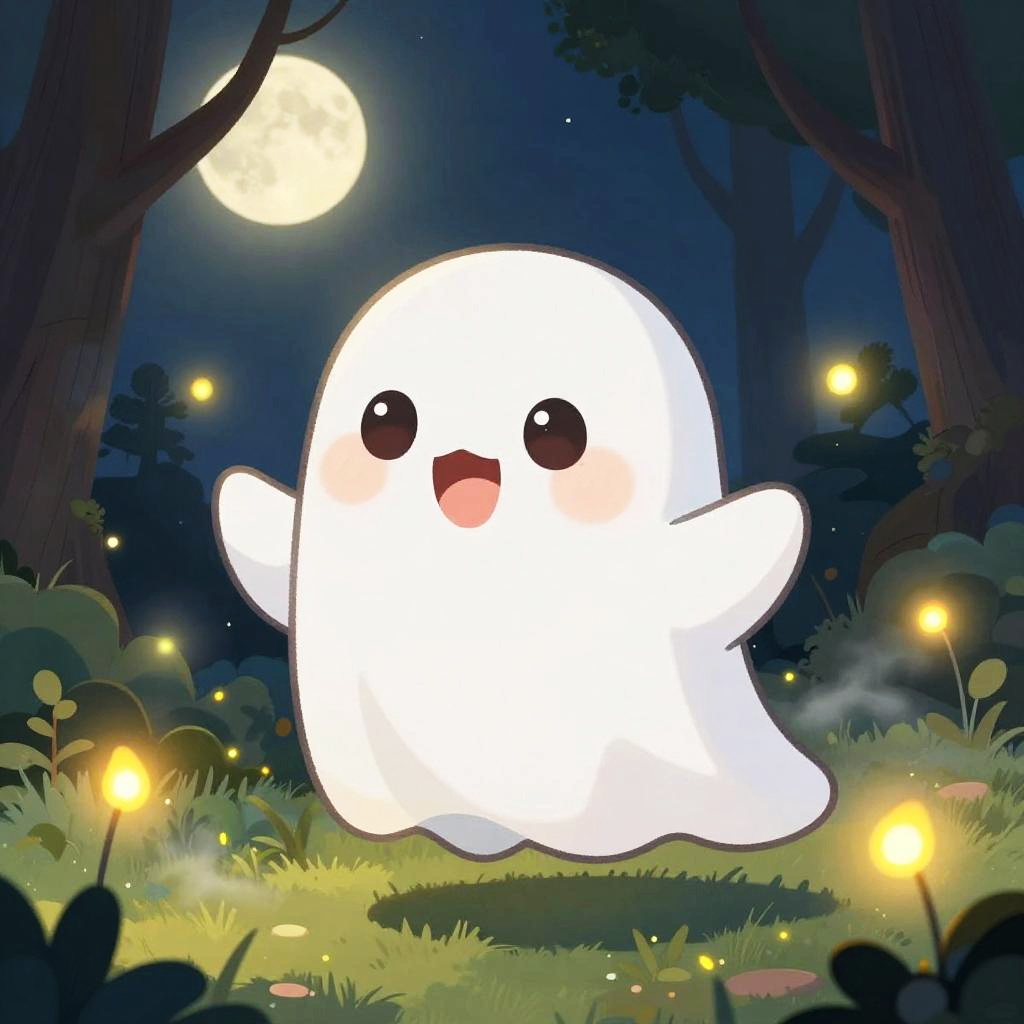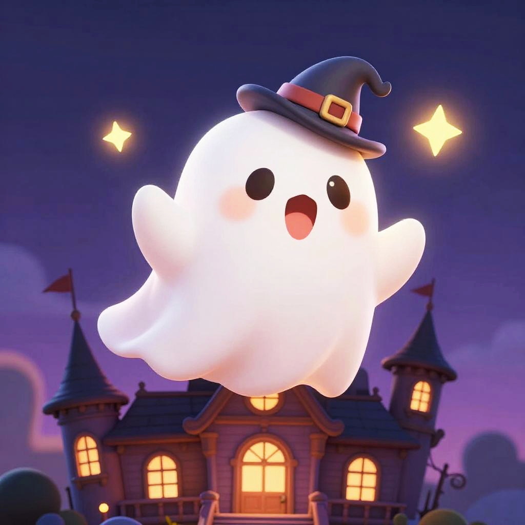 Adorable cute animated ghost wearing a tiny hat, playfully hovering over a vintage haunted mansion, with soft glowing aura and sparkling eyes, rendered in bright, cheerful colors with smooth, rounded shapes.
