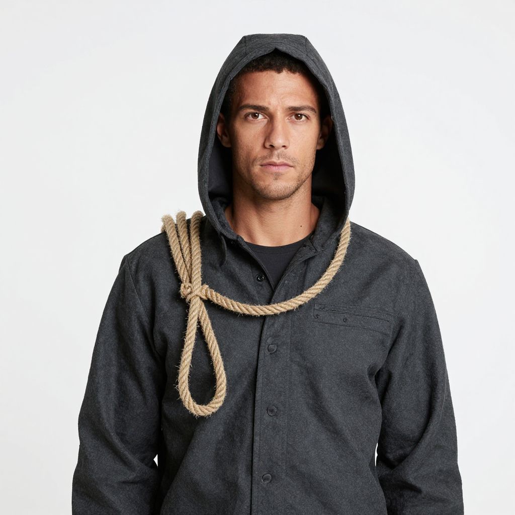 Photograph of a medium-build, light-skinned man with short dark hair and a trimmed beard, wearing a black hooded jacket. The jacket has a coarse texture and is buttoned up. A thick, beige rope is draped over his shoulders, with one end hanging down the front. He gazes directly at the camera with a neutral expression. The background is completely white, making the subject stand out sharply. The lighting is even, highlighting the textures and colors of his clothing and the rope.