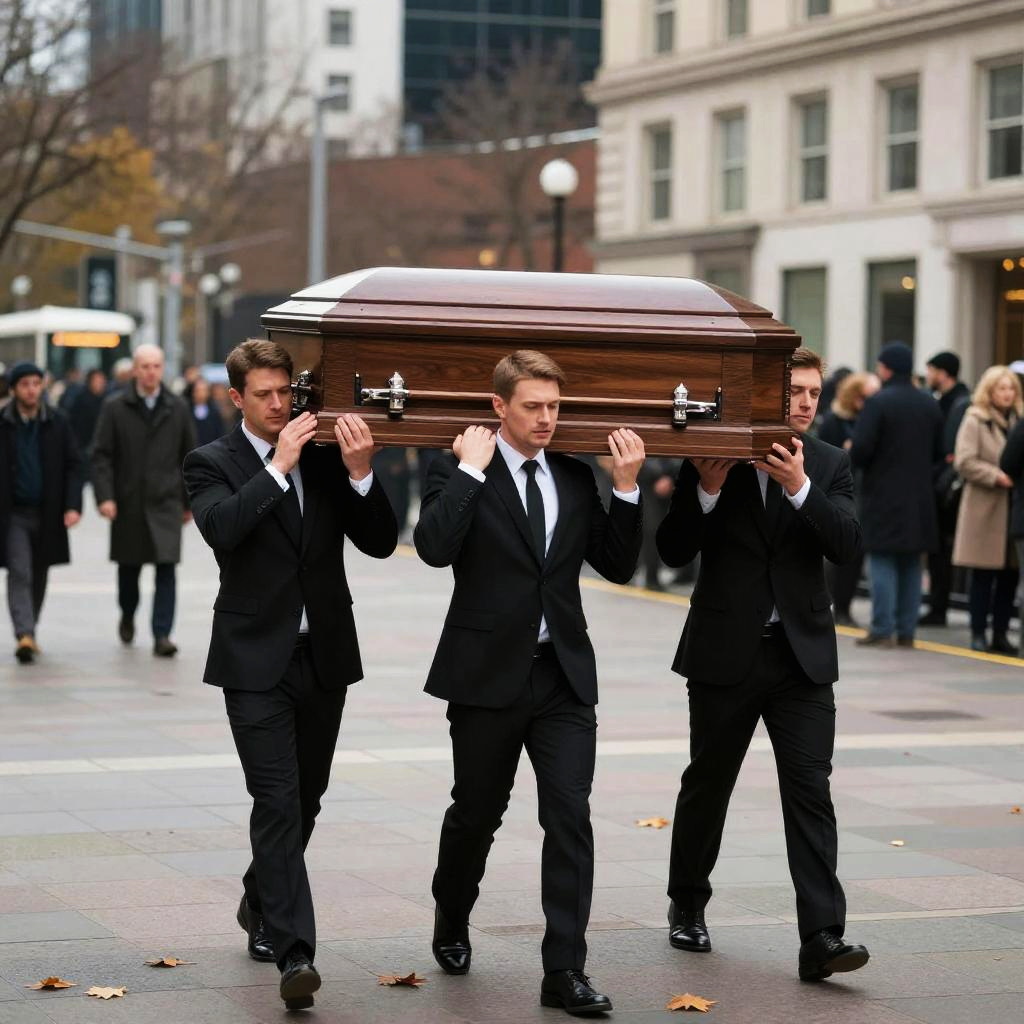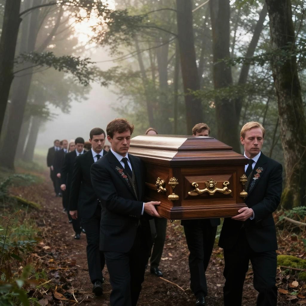 Pallbearers carrying an ornate wooden coffin through a misty forest at dawn, somber expressions, traditional dark suits, soft ethereal light filtering through tall trees, intricate embroidery on garments, cinematic and emotional atmosphere.
