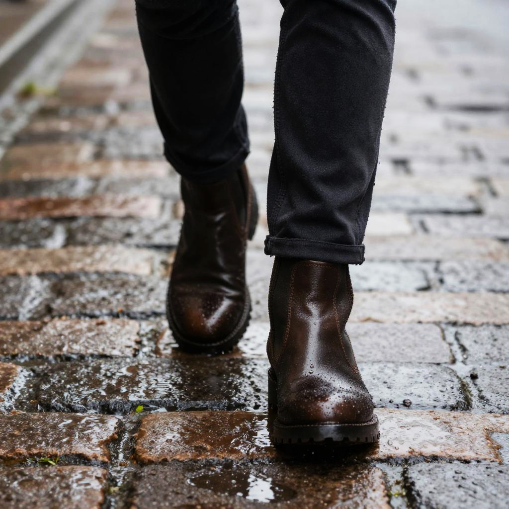Close-up of wet look boots walking through puddles on a cobblestone street, rain droplets on shiny material, moody atmosphere, photorealistic