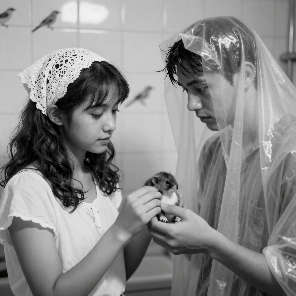 Black-and-white photograph of two people. Young woman with wavy hair in lace cap and blouse, holding a document. Young man with wet hair, partially covered by plastic sheet, looking at document. Background: tiled wall with bird patterns. Woman's expression: focused. Man's expression: curious. Plastic sheet slightly wrinkled, draped over his head and shoulders. Both standing close, interacting with document.