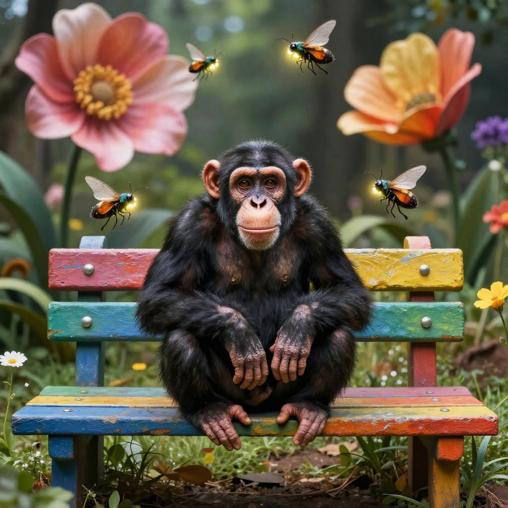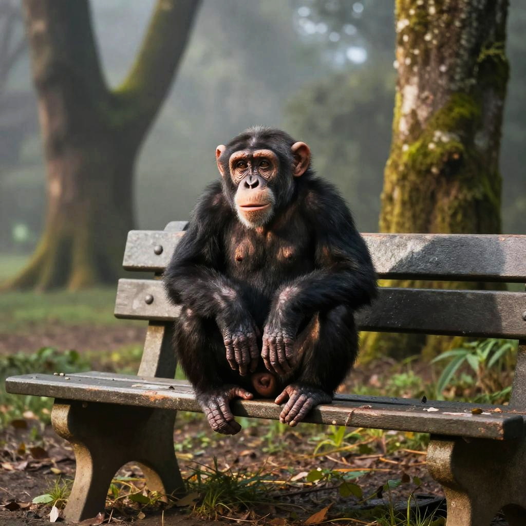 Chimpanzee resting on a stone bench beside a tranquil river in a dense rainforest, mist rising from the water, exotic plants and orchids around, photorealistic details on the chimpanzee and natural environment, calm and reflective mood