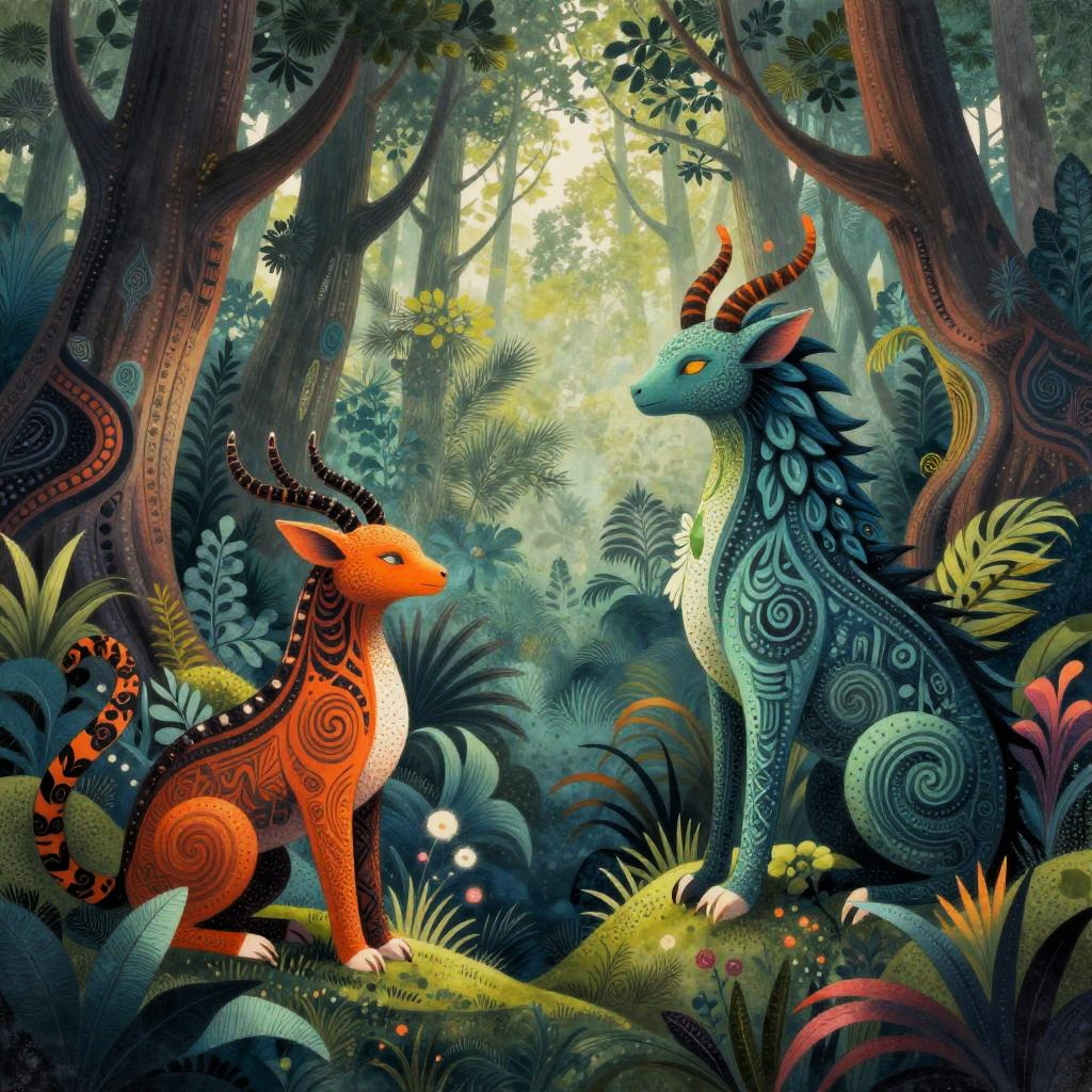 Midjourney tattoo design of a mystical forest scene with mythical creatures intertwined with flowing tribal patterns, vibrant colors combined with fine dotwork and smooth gradients, showcasing a surreal and magical atmosphere.