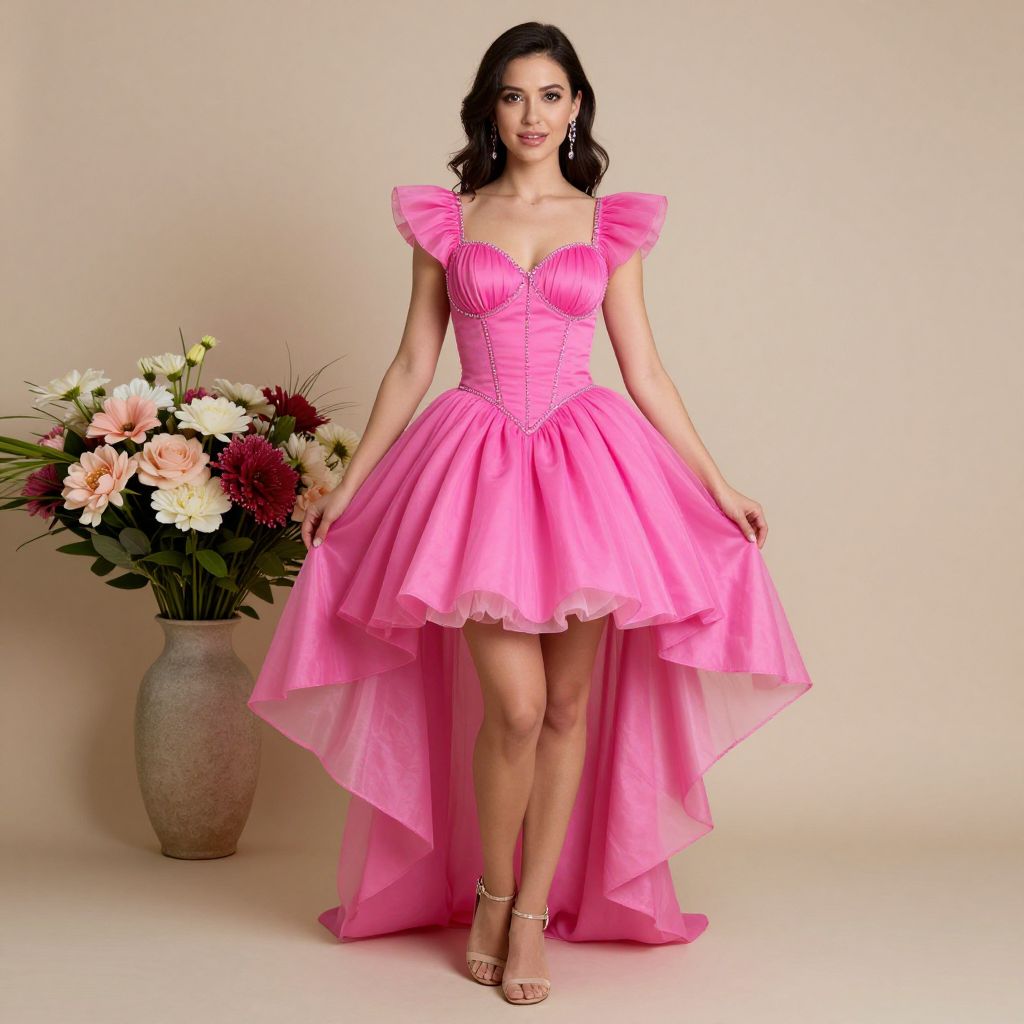 Photograph of a young woman with fair skin and dark wavy hair, wearing a vibrant pink, strapless, tiered ball gown with ruffled shoulders and a fitted bodice. The dress has a long, flowing skirt that cascades down to the floor. She stands confidently with a slight smile, wearing gold high-heeled sandals. Behind her is a beige background and a large, gray ceramic vase filled with a bouquet of white, pink, and red flowers with green foliage. The overall style is elegant and formal.