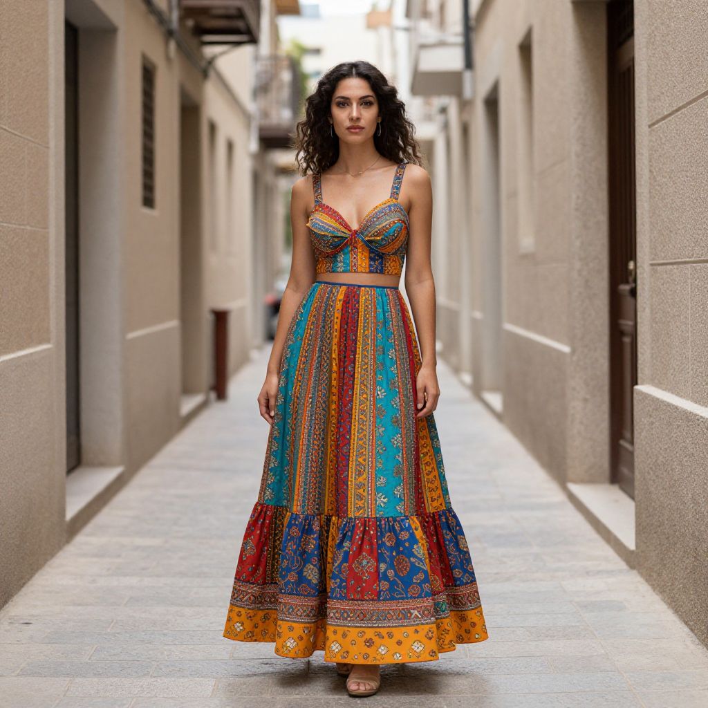 Photograph of a young woman with curly dark brown hair standing in a narrow, urban alleyway. She wears a vibrant, floor-length, sleeveless dress with a deep V-neck, featuring a colorful, patterned design in blue, red, orange, and yellow. The dress has a fitted waist and a flared skirt. Her skin tone is light brown, and she has a neutral expression. The alleyway has beige, textured walls with small windows and a concrete floor. The background is slightly blurred, emphasizing the woman and her dress. She stands confidently in the center of the image.