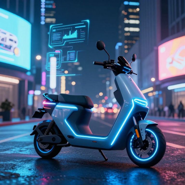 Electric motorcycle glowing with futuristic blue neon lights, resting on a high-tech urban street at night, holographic billboards illuminating the wet asphalt, cyberpunk aesthetic with sleek aerodynamic design and vibrant cityscape background.